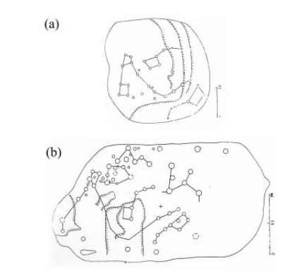 일부 고인돌에는 다양한 크기의 컵 마크가 두 개 이상 있습니다. 그들은 연마 또는 절단으로 형성되며 일부 컵 마크는 홈으로 연결됩니다. 특히, 동촌리 (동춘 리) 하만 (시안)의 고인돌에서도 동심원이 발견됩니다. 많은 고인돌에서 많은 컵 마크가 발견되었지만 컵 마크의 의미는 아직 완전히 설명되지 않았습니다. 국내 학자들은 컵 마크의 의미를 풍요와 생산을 기원하거나 가족 관계의 표현으로 제시했고, 외국 학자들은 컵 마크를 불의 흔적, 장례식, 태양의 숭배, 또는 천국 예배등으로 분석했습니다. 그러나 그는 특정 별자리로 구멍을 식별하지 못했습니다. Park et al. (2001)은 1975 년 이씨가 아드 기 고인돌 주변에서 발견 한 65 개의 컵 마크가있는 석판을 분석했습니다. 그들은 정량적 분석을 통해 북두칠성, 작은 곰 자리, 드레이코, 카시오페이아로 석판의 구멍 일부를 식별했다. 무화과. 거울은 석판의 컵 마크와 별자리 패턴을 보여줍니다. 한국 북부에는 컵 마크가있는 고인돌이 약 200 개 있고 그중 18 개는 큰곰 자리, 작은 곰 자리, 코로나 보레 알리스, 용자리, 처녀 자리, 궁수 자리, 세페 우스 등 별자리로 식별되는 컵 마크가 있습니다. 고인돌의 건설 시대는 별들의 세차 운동으로 추정되었다 식별 된 별자리와 예상되는 건설 시대를 가진돌은 아래의 그림에 나열되어 있습니다.