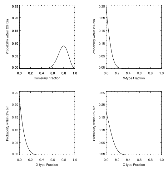 IDP에 제한적으로 기여하는 성간 먼지 입자는 태양계 물체의 광학 특성과 매우 다른 광학 특성을 갖기 때문에 성간 먼지 입자는 고정 된 알베도 값 A = 0.673 및 스펙트럼 구배 S를 갖는다 고 가정했습니다. = −23.2 ± 0.8 % · 1000 ˚A−1 (Draine 2003), 다음 분석에서는 통계적 분포를 고려하지 않았습니다. 성간 먼지의 광학적 특성은 평균 은하수 먼지로 추정되었으므로 태양 주변의 성간 먼지는 값에 따라 다를 수 있습니다. 그러나 우리는이 작업에서 그러한 가능성을 무시했습니다. 소스 모집단의 부분 기여도 조합을 위해 2 % 그리드를 만들었습니다. 그런 다음 주어진 기여도에 따른 소스 집단의 확률 분포의 선형 조합을 통해 단일 먼지 입자의 광학적 특성에 대한 혼합 확률 분포를 생성 할 수있었습니다. 평균 알베도에 따라 다른 개체군에 가중치를 부여했습니다. 단일 입자에 대한 확률 분포에서 MC 시뮬레이션을 사용하여 IDP 복합체에 대한 알베도와 스펙트럼 기울기 모두의 예상 평균 값을 계산했습니다. 모든 그리드 지점에서 500 개의 샘플 입자의 평균 광학 특성 값이 3000 회 계산되었습니다. 이러한 조건에서 3000 개의 평균값은 황도광 측정에 대한 불확도의 10 % 미만의 표준 편차로 가우스 분포를 따릅니다. 각 격자 점에서 MC 시뮬레이션의 평균값 분포를 오류가있는 황도광의 측정 값과 비교하여 격자 점에서 가상의 IDP 구름을 관찰하면 측정 값이 나올 확률을 도출했습니다. 확률은 플랫 사전을 사용하는 베이지안 분석을 통해 실제 부분 기여도를 나타내는 그리드 포인트의 확률로 간주되었습니다. 표 2.2는 개별 소스에서 IDP 클라우드에 기여한 결과를 보여줍니다. 범위 (표 2.2에서 더하기 및 빼기 기호로 표시됨)를 도출하기 위해 6 차원 그리드에서 동일한 확률로 등고선을 만들고 가장 가능성이 높은 경우 주변의 등고선 내 총 확률을 계산하고 범위를 도출했습니다. 68.3 % 신뢰 구간으로. 2.2 절에서 예측 한 바와 같이 혜성 핵 (Dtype 소행성 포함)이 IDP 구름의 주요 기여자 (~ 94 %)임을 발견했습니다. 나머지 부분 (~ 6 %)은 C 형, X 형, B 형 소행성에서 비롯됩니다. S 형 소행성과 성간 먼지는 IDP에 미미한 영향을 미칩니다